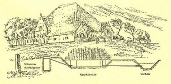 Pflanzenkläranlagen unterscheiden sich von technischen Kläranlagen im Wesentlichen dadurch, dass in ihnen das Abwasser ohne künstliche Belüftung gereinigt wird. Während der Passage des Abwassers durch den von Schilf durchwurzelten Boden oder durch mit Schilf oder Binsen bepflanzten Kies/Sandschichten, wird das Abwasser sowohl mechanisch gefiltert, als auch durch die im Boden Mikroorganismen gereinigt. Gemeinsames Kennzeichen der Pflanzenkläranlagen ist die Bepflanzung mit Sumpfpflanzen (Schilf, Binsen u. a.), denen ein aktiver Beitrag zur Reinigung des Abwassers zugeschrieben wird. Die wesentliche Reinigungsleistung einer Pflanzenkläranlage erfolgt durch Bakterien, die sich im Wurzelbereich der Pflanzen ansiedeln und sich aus dem vorbeifließenden Wasser ernähren. Die Pflanzen dienen als "Wirt", von denen sich die Bakterien vorwiegend mit Sauerstoff versorgen. Der Nachteil gegenüber den kompakten Behälteranlagen ist der vergleichsweise hohe Platzbedarf. Je nach Verfahren werden mindestens 2-5 m² Fläche pro Einwohnergleichwert benötigt. Die Mindestfläche eines Pflanzenbeetes wird mit 25 m² angegeben. Um eine große Oberfläche für die zahlreichen Umwandlungsprozesse zur Verfügung zu stellen, ist eine ausreichend tiefe Durchwurzelung notwendig. Rohrschilf zum Beispiel erreicht eine Durchwurzelung bis in 1,20 m Tiefe. Für die meisten Pflanzenkläranlagen ist eine Wurzeltiefe von ca. 60 cm jedoch ausreichend. Typen der PflanzenkläranlagenPflanzenkläranlagen werden in drei Grundtypen unterschieden: 1. in Pflanzenkläranlagen mit wasserüberstauten Beeten 2. in Pflanzenkläranlagen mit nicht bindigem Filtermaterial auf der Basis von sandig-kiesigem Boden. Das Wasser durchströmt den Boden vorwiegend in vertikaler Richtung. 3. in Pflanzenkläranlagen mit bindigem Filtermaterial; hier wird der Bodenkörper horizontal vom Abwasser durchflossen. 4. Mischformen dieser Grundtypen ergeben sich manchmal während des Betriebs oder sind als solche von vornherein geplant. Die mechanische Vorklärrung des Abwassers beim Betrieb von Pflanzenkläranlagen ist sinnvoll, da der Verlauf der anfallenden Abwassermenge gleichmäßiger wird. Darüber hinaus wird die Sedimentation ungelöster Abwasserinhaltsstoffe in der Pflanzenstufe verhindert. Diese mechanische Entschlammung vermeidet zusätzlich eine Verschlechterung der hydraulischen Eigenschaften des Bodenkörpers. Hygiänische Probleme können so vermieden werden. Horizontales VerfahrenDas Abwasser wird über die Mehrkammerabsetzgrube unterhalb der Beetoberfläche in die Anlage eingeleitet. Das Abwasser durchfließt den Bodenkörper und wird auf der Sohle am Ende der Anlage in Filterrohren aufgesammelt und über einen Kontrollschacht in ein Gewässer geleitet oder im Untergrund versickert. Für horizontal durchflossene Anlagen werden mindestens 5 m² Pflanzfläche angesetzt. Bei der Berechnung der notwendigen Fläche müssen der Zu- und Ablaufbereich mitberücksichtigt werden. Vertikales VerfahrenBeim vertikalen System wird das Abwasser über ein Verteil-System auf der Pflanzfläche in den Bodenkörper eingebracht. Das Wasser wird gleichmäßig über die gesamte Pflanzfläche verteilt und rieselt aus den Verteilerrohren in den Bodenkörper. Auf der Sohle der Anlage wird das gereinigte Wasser gesammelt und ebenfalls über einen Kontrollschacht in ein Gewässer geführt oder im Untergrund verrieselt. Betriebshinweise